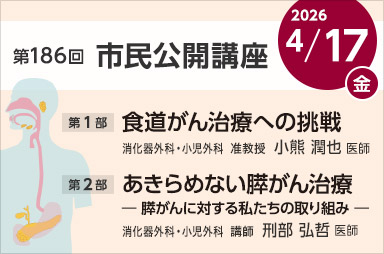 2026年4月17日(金)〈第1部〉『食道がん治療への挑戦 』〈第2部〉『あきらめない膵がん治療 ― 膵がんに対する私たちの取り組み ― 』申込不要、入場無料です。 - 2026.03.25 診療科
