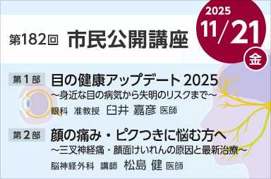 2025年11月21日(金)〈第1部〉『目の健康アップデート2025~身近な目の病気から失明のリスクまで~』〈第2部〉『顔の痛み・ピクつきに悩む方へ~三叉神経痛・顔面けいれんの原因と最新治療~』申込不要、入場無料です。