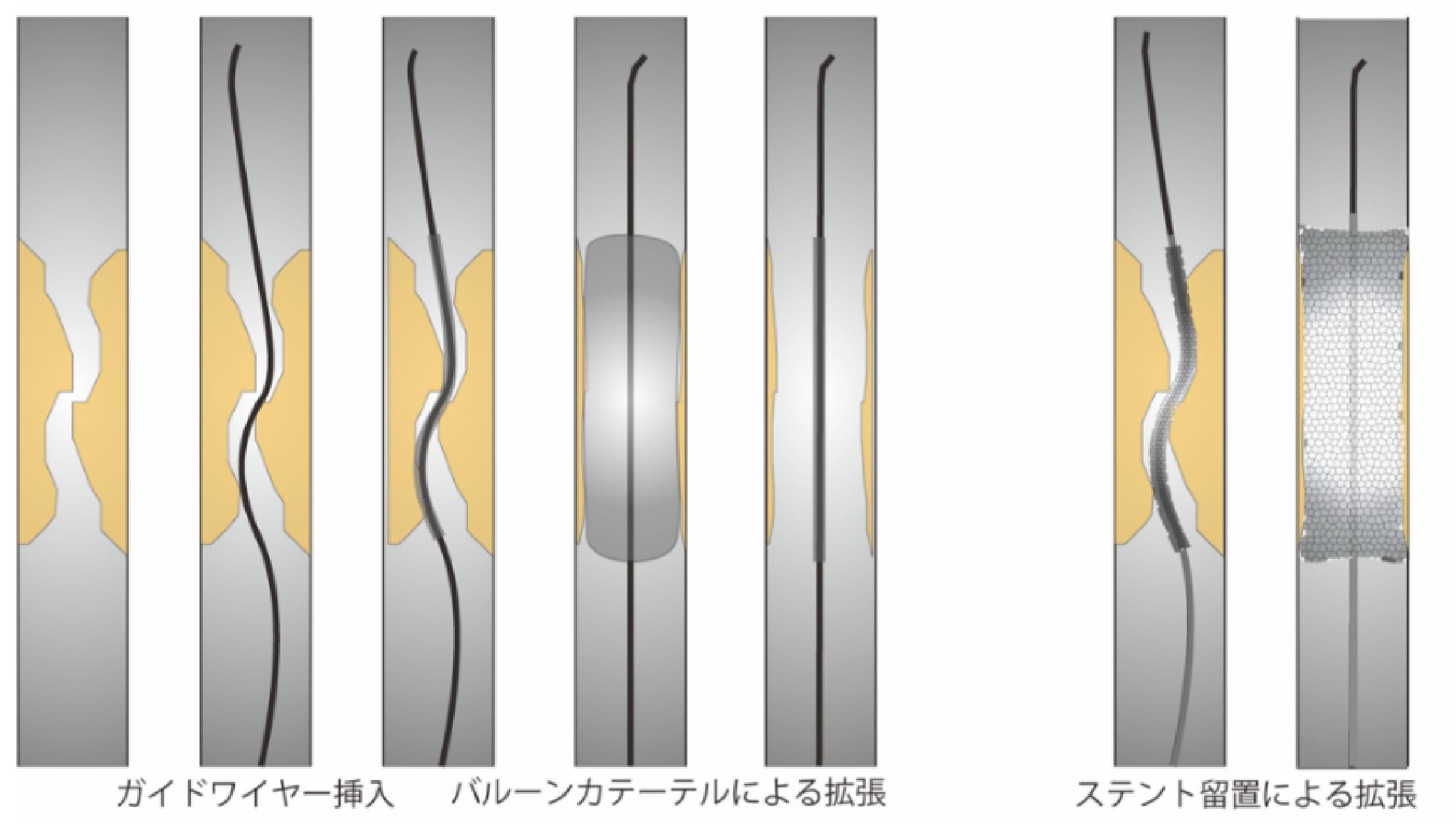 治療は病変部にカテーテルを挿入し、狭窄部(閉塞部)の拡張を行います。治療の手順は血管内にカテーテルを入れ、X線の画像を見ながら目的の血管までカテーテルを進め、血管を描出するための造影剤を注入し、血管の狭窄程度や血流の状態を詳しく調べます。狭窄部(閉塞部)にガイドワイヤーを慎重に挿入し、狭窄部(閉塞部)を通過させた後、バルーンカテーテル(風船のついたカテーテル)を挿入し、狭窄部(閉塞部)をバルーンで拡張し、金属性のステントでしっかりと拡張します。