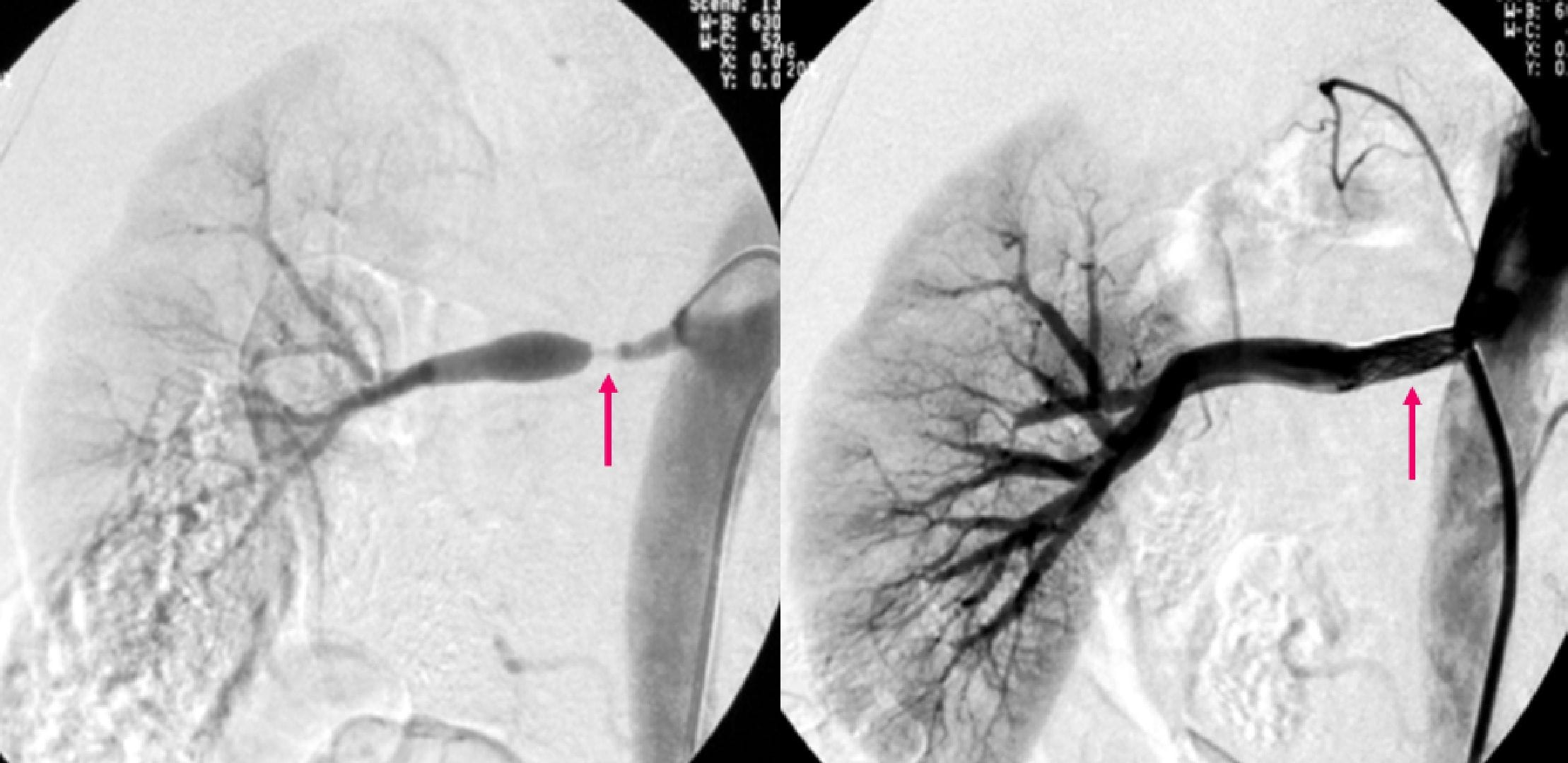 (右図)治療完了後の血管造影です。門脈からの造影で、門脈から肝静脈が描出されており、治療に成功しました(矢印)。
