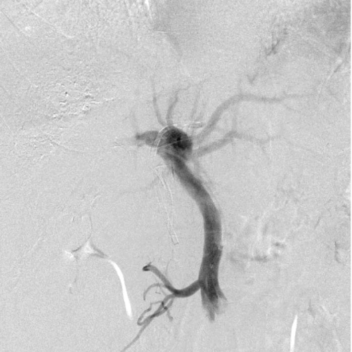 内臓動脈瘤とは、脾臓、腎臓、肝臓、腸管などに栄養を送る動脈にできた「コブ」のことです。動脈硬化や高血圧、感染、外傷などが原因となります。通常は無症状で、健康診断や他の疾患の精密検査で偶然見つかる場合が多いですが、2.0cm以上のものは破裂しやすく、破裂した場合、死亡率が高いため治療が必要です。カテーテルを用いて金属製のコイルで塞栓術を行います。瘤の塞栓が不可能な場合は、ステントグラフトを用いて治療します。