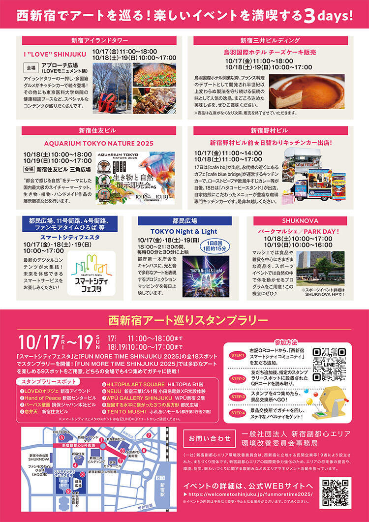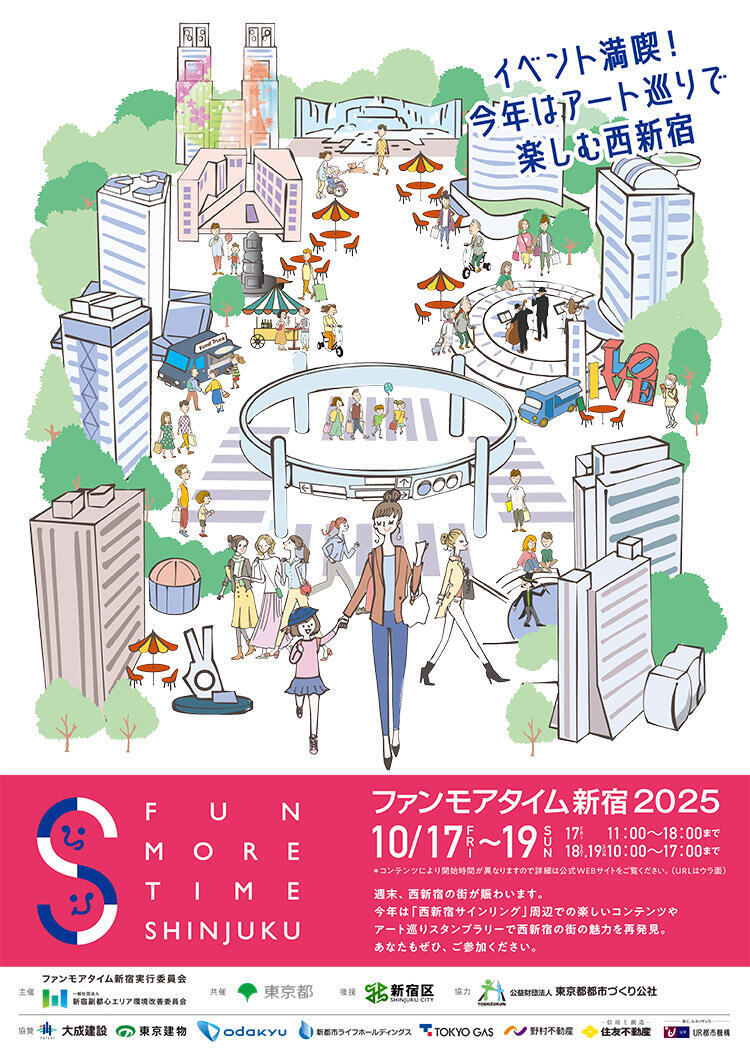 2025年10月17日(金)~10月19日(日)の 3日間、新宿副都心5号街路を中心とした新宿副都心エリア内の公開空地(都民広場を含む)や車道を含む道路空間等を一体的に利活用し、多様な人々の滞在・交流・回遊を促進するための、今年で4回目を迎える社会実験『FUN MORE TIME SHINJUKU 2025(ファンモアタイム新宿 2025)』 が実施されます。