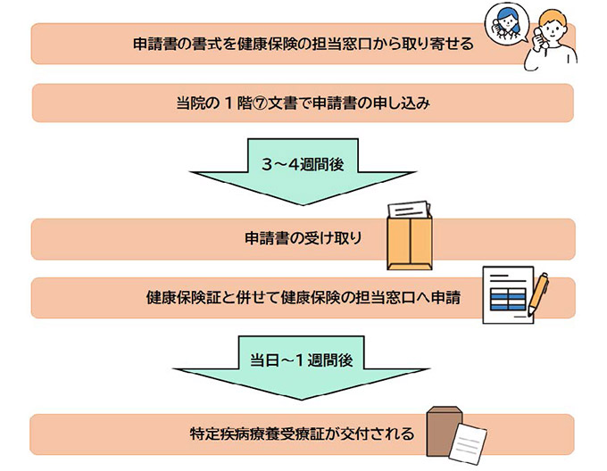 | 必要な書類: | 特定疾病療養受療証申請書(医師の記載欄あり) 健康保険証・マイナ保険証 |