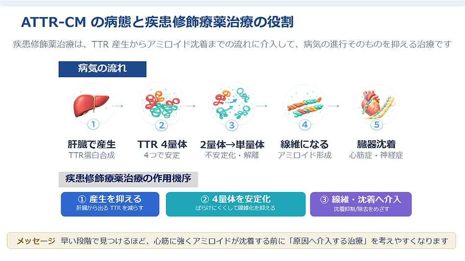 さらに、画像診断の進歩と疾患修飾治療の開発により、早期発見と早期介入が可能になってきています。適切な診断や治療が行われない場合、心アミロイドーシスは進行性心不全を来し、生命予後に影響します。予後は病型や診断時期に大きく左右されるため、迅速で正確な診断と適切な治療が重要です。