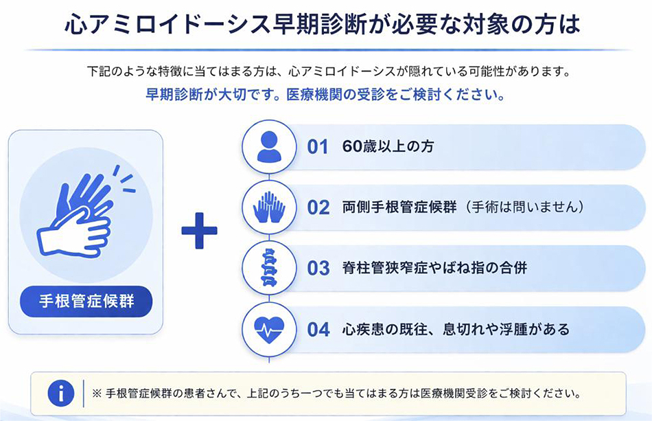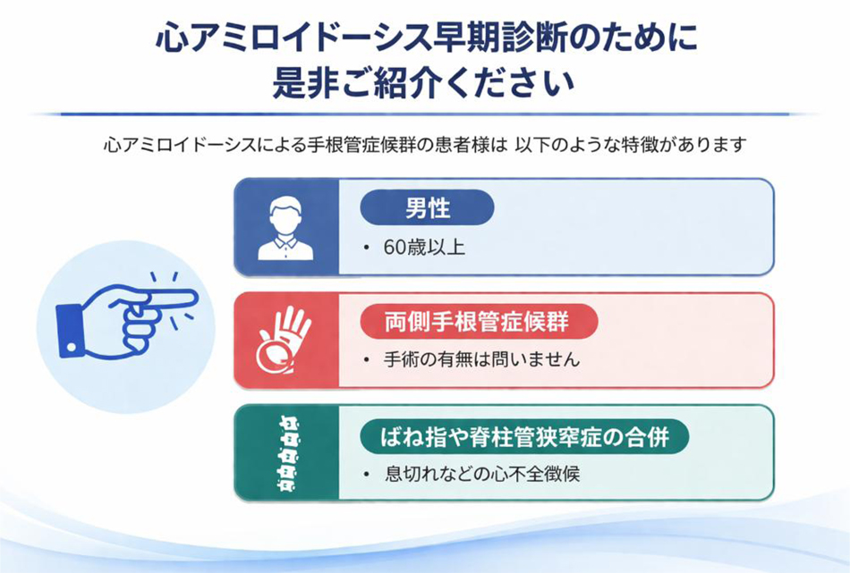 そのため、手根管症候群の患者さんに心臓スクリーニングを行うことで、ATTR心アミロイドーシスを早期に診断できる可能性があります。